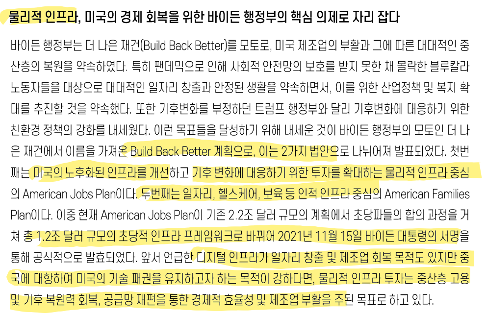 - 이에 바이든 비롯 초당적으로 미국은 1.2조 달러 규모의 엄청난 규모의 물리적 인프라 법안을 2021년에 통과.