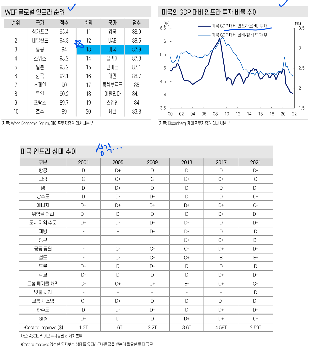 - 인프라 분야 세계 13위이며 거의 모든 공공 인프라 부분에서 C 등급 이하임. (B 등급이 보통)
