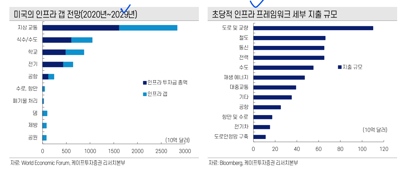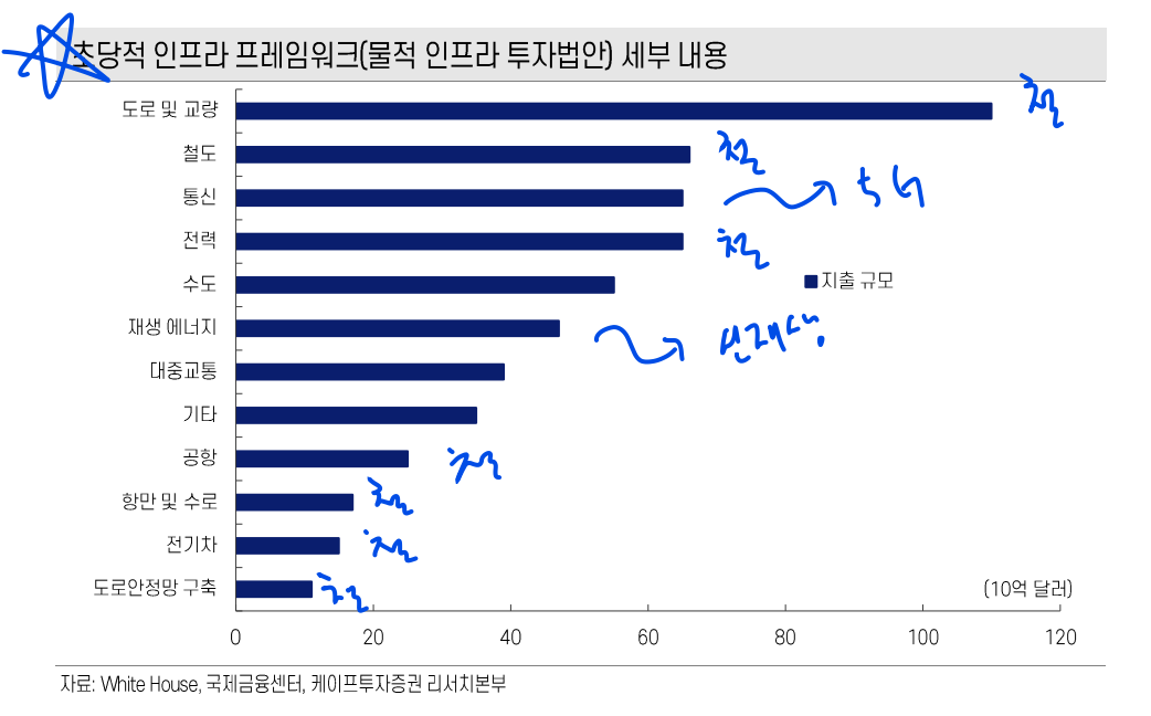 - 과거와는 달리 이번 인프라 투자에는 미래의 친환경, 신재생으로의 대 전환 시대에 맞게 해당 산업과 연계가 가능하도록 진행되므로 친환경 섹터 군의 기업들도 할 일이 많아질 것.