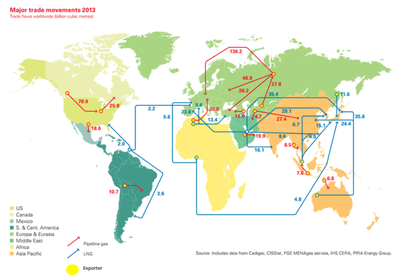 - 흐름에 맞춰 기술하자면 LNG의 경우 가스전을 탐사해 천연가스 생산 후 액화시켜 LNG 탱크에 저장. 그 후 선박을 통해 수송해 수입국의 LNG 탱크로 하역하고 그다음 재기화시켜 수요처로 보낸다.