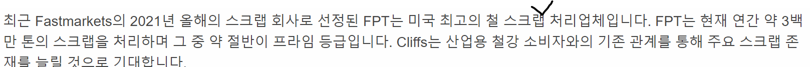 => 철 스크랩이란 일종의 사용한 후 다시 회수한 고철로서 ESG와 친환경 경영에 대한 이슈가 각광받는 요즘 철광석 생산 분만큼의 CO2 발생이 감소되기에 요즘 인기가 높아지고 있음. 즉 철광석에서 펠릿으로 제작하는데 들어가는 코크스 등으로 인한 탄소 배출의 감소로 친환경 드라이브에 신경을 쓰고 있다는 점.
