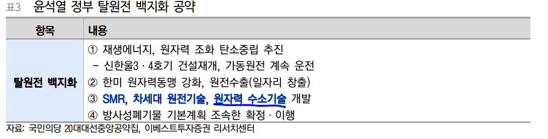 - 저 가격의 우라늄과 기저 발전인 원자력을 활용해 전력 수요가 낮은 심야시간 등에도 전기를 계속 생산해 청정 수소를 만들어 수소 밸류체인에 기여하겠다는 복안.