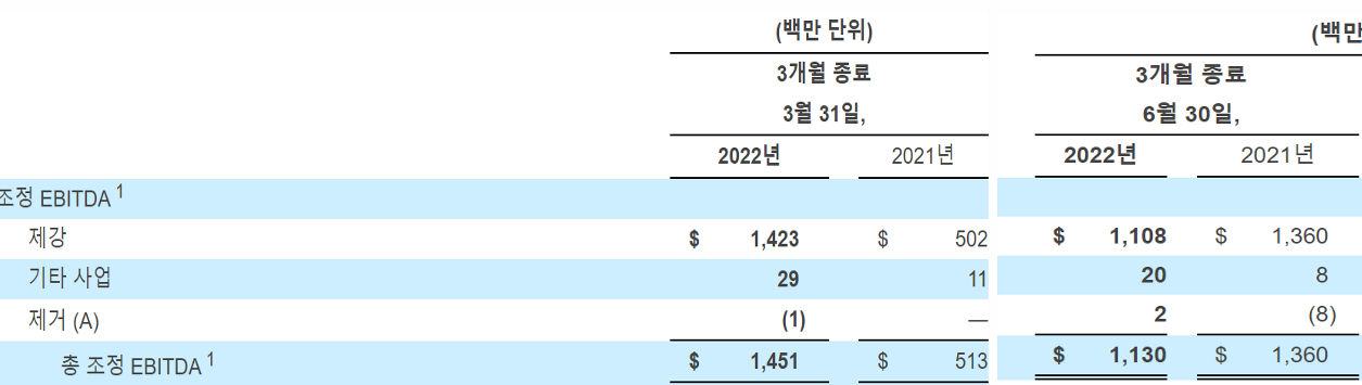 - 22년 기준해서는 EBITDA가 1분기에는 1451백만 불인데 2분기에는 1130백만 불로 22% 감소했습니다.
