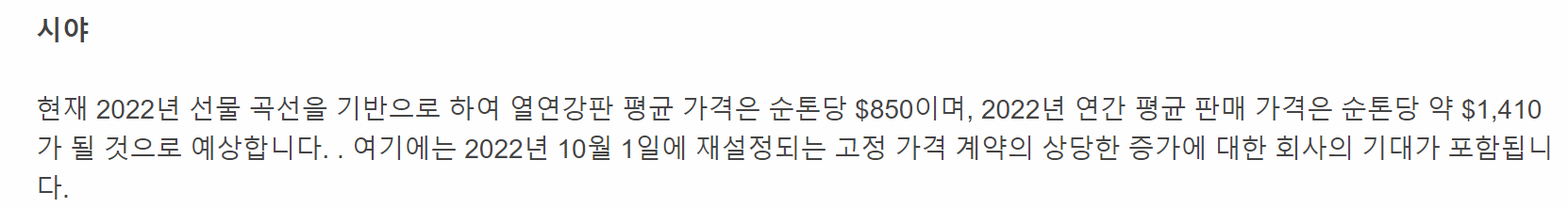 - 긍정적인 사항으로는 철강 판매량은 제법 견조하고 또 고정 가격을 높게 잘 맺어둔 게 유효해서 판가는 오히려 작년보다는 높습니다.