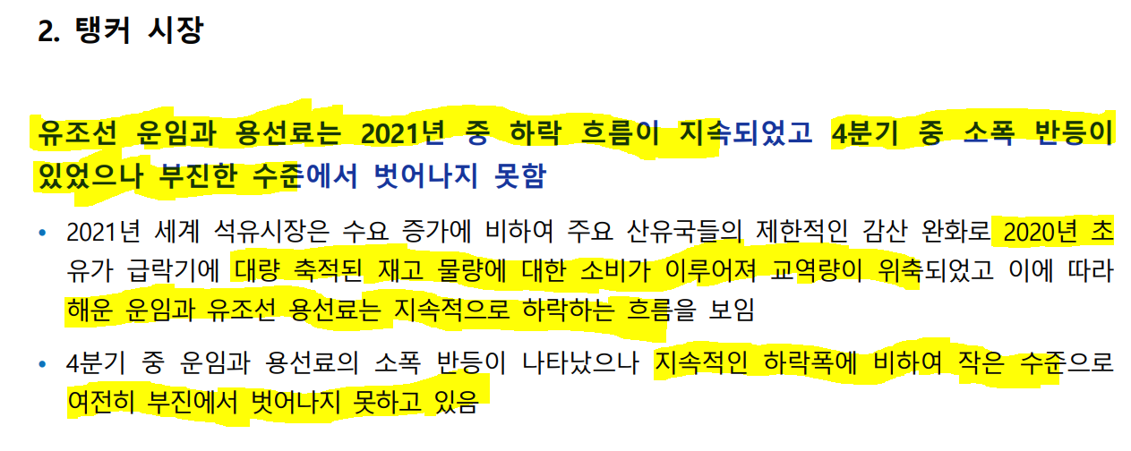 더 이상 나빠질 것이 없는 진바닥이고 앞으로는 회복에 따라 수요 증가에 힘입어할 일이 많아질 탱커가 예상되네요.